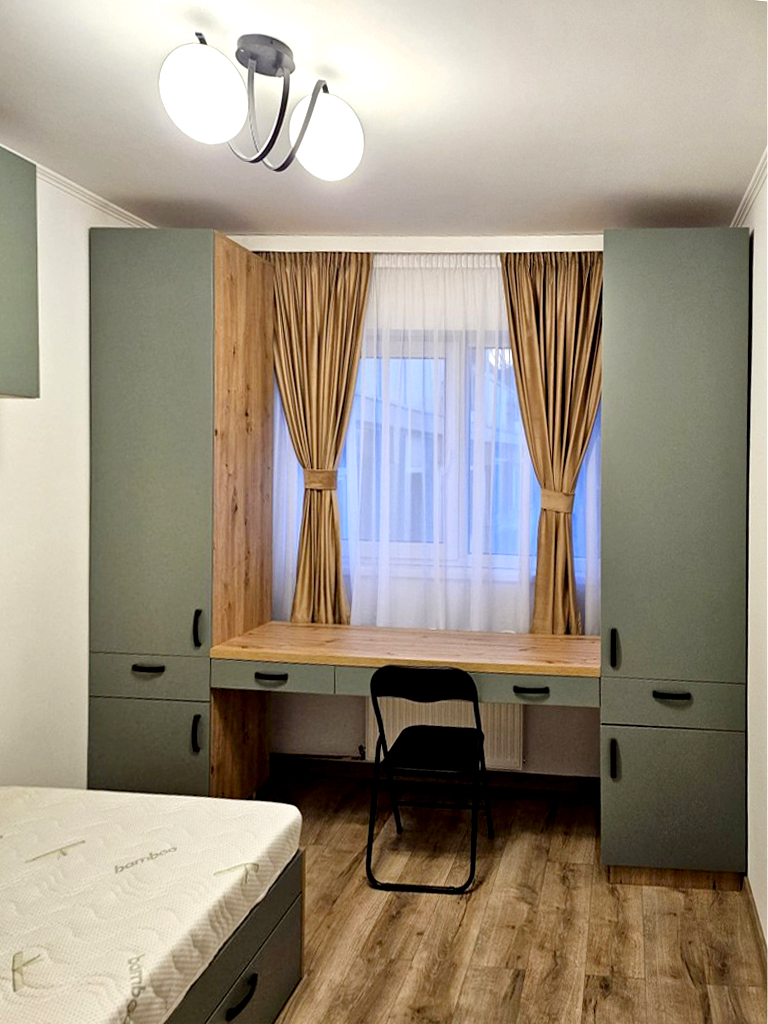 Stare imobil: renovat si utilat LUX (totul nou) Pardoseli: parchet, gresie Pereti: faianta, zugravit lavabil Tamplarie interioara: usi din lemn Tamplarie exterioara: ferestre din PVC cu geam termopan Usa intrare: metalica Balcon: inchis in PVC cu geam termopan, izolat si placat cu gresie Izolatie termica: exterioara Incalzire: cu centrala termica proprie pe gaze si calorifere Mobilier si dotari: apartamentul se inchiriaza complet mobilat si utilat, cu televizor, plita electrica, hota, cuptor electric, frigider, masina de spalat vase, masina de spalat rufe, aspirator, conexiune internet (v. foto) Alte detalii: dormitorul 2 va fi mobilat dupa nevoile chiriasului (ca birou sau dormitor copil) Disponibilitate: imediat