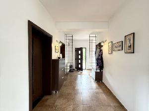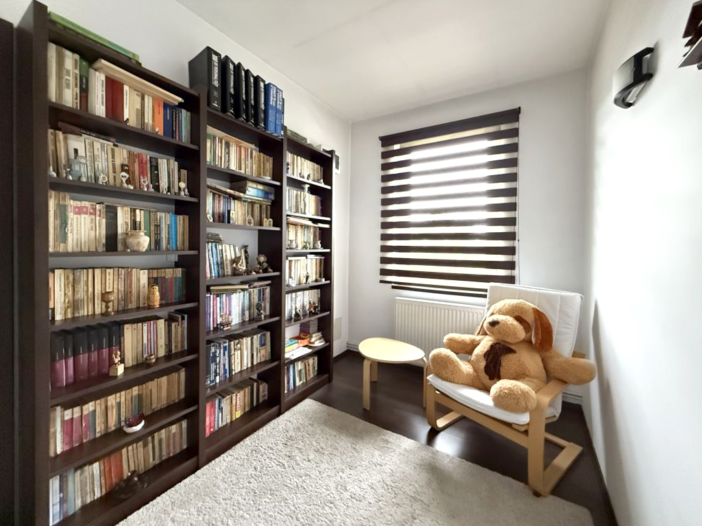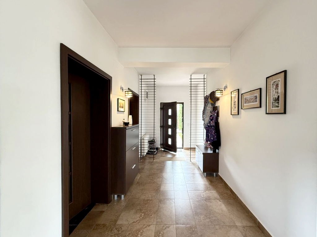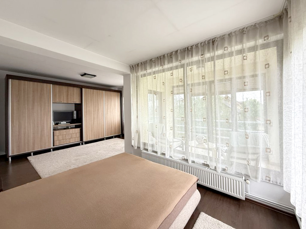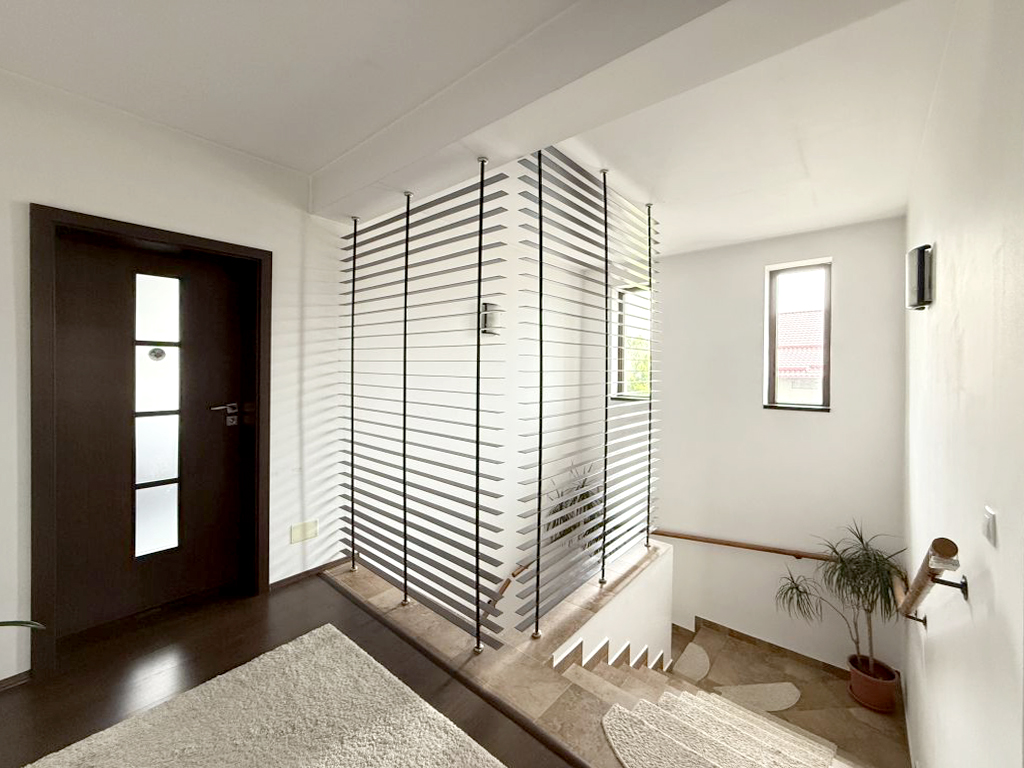 Regimul de inaltime: P+E, cu scara interioara Compartimentare: - la parter: living, bucatarie, 1 dormitor/birou, camera tehnica, 1 grup sanitar, hol, terasa, garaj (cu acces din exterior si interior) - la etaj: 3 dormitoare, 1 baie, hol, 1 balcon Structura de rezistenta: fundatie si placi din beton (peste parter si peste etaj), pereti din caramida Stare imobil: constructie 2016, finisaje si dotari de calitate; stare foarte buna Izolatie termica: termosistem din polistiren; pod izolat termic cu vata bazaltica Utilitati: apa, energie electrica, gaze, fosa septica Incalzire: centrala termica proprie cu gaze si calorifere; suplimentar, incalzire prin pardoseala la parter; semineu cu lemne la parter; panouri solare pentru apa calda Climatizare: aer conditionat Pardoseli: parchet, gresie Pereti: faianta, zugravit lavabil Tamplarie interioara: usi celulare Tamplarie exterioara: ferestre din PVC cu geam termopan Acoperis: tabla tip Lindab Mobilier si dotari: vila se vinde complet mobilata si utilata (v. foto) Dotari exterioare: pavaje, gradina amenajata, vegetatie matura Acces: pe drum asfaltat, iluminat Stare juridica: proprietate intabulata, fara sarcini