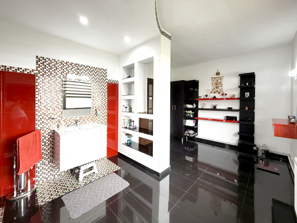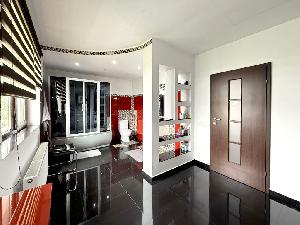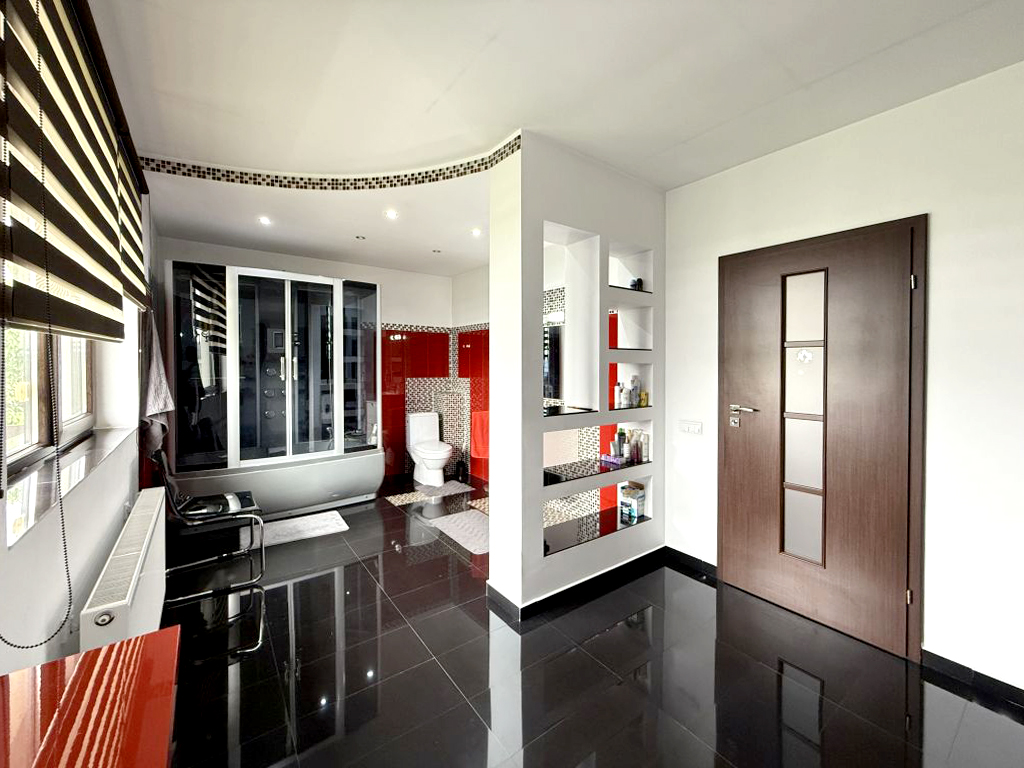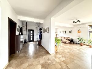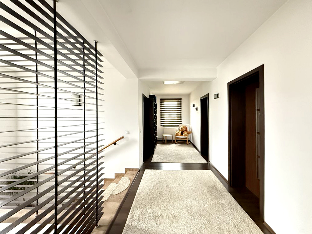 compartimentare interioara, placa de beton Stare imobil: constructie noua, complet finisata si utilata modern Izolatie termica: exterioara Utilitati: apa, energie electrica, gaze, canalizare, internet Incalzire: centrala termica proprie cu gaze; incalzire in pardoseala cu termostat pe fiecare camera, distribuitor de caldura Climatizare: aer conditionat Pardoseli: parchet, gresie Delta Studio Pereti: faianta Delta Studio, zugravit lavabil Tamplarie interioara: usi celulare Porta Doors Tamplarie exterioara: ferestre din PVC Salamander 7 camere cu geam tripan Acoperis: tabla tip Lindab Mobilier si dotari: vila