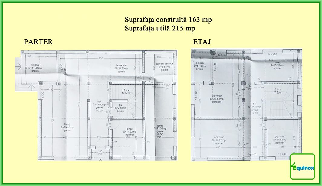 Compartimentare: - la parter: living+bucatarie (open space), 1 dormitor, 1 baie, hol, terasa exterioara acoperita - la etaj: 3 dormitoare, 2 bai (dintre care una la dormitorul matrimonial),hol, 1 balcon Structura de rezistenta: fundatie si placa din beton, pereti din caramida Stare imobil: constructie noua, finisata (fara cemtrala termica si obiecte sanitare in bai) Izolatie termica: exterioara si interioara Utilitati: apa, energie electrica, gaze, canalizare Incalzire: prin pardoseala, cu centrala termica proprie cu gaze Pardoseli: parchet, gresie, marmura Pereti: faianta, zugravit lavabil Tamplarie interioara: usi din lemn Tamplarie exterioara: ferestre din PVC cu geam termopan Acoperis: din tabla Dotari exterioare: pavaje, gradina amenajata, iluminat, 2 locuri de parcare auto Acces: pe drum asfaltat si pietruit, iluminat Alte informatii: imobilul dispune de sistem de alarma si telecomanda poarta Stare juridica: proprietate intabulata, libera de sarcini Disponibilitate: la data vanzarii